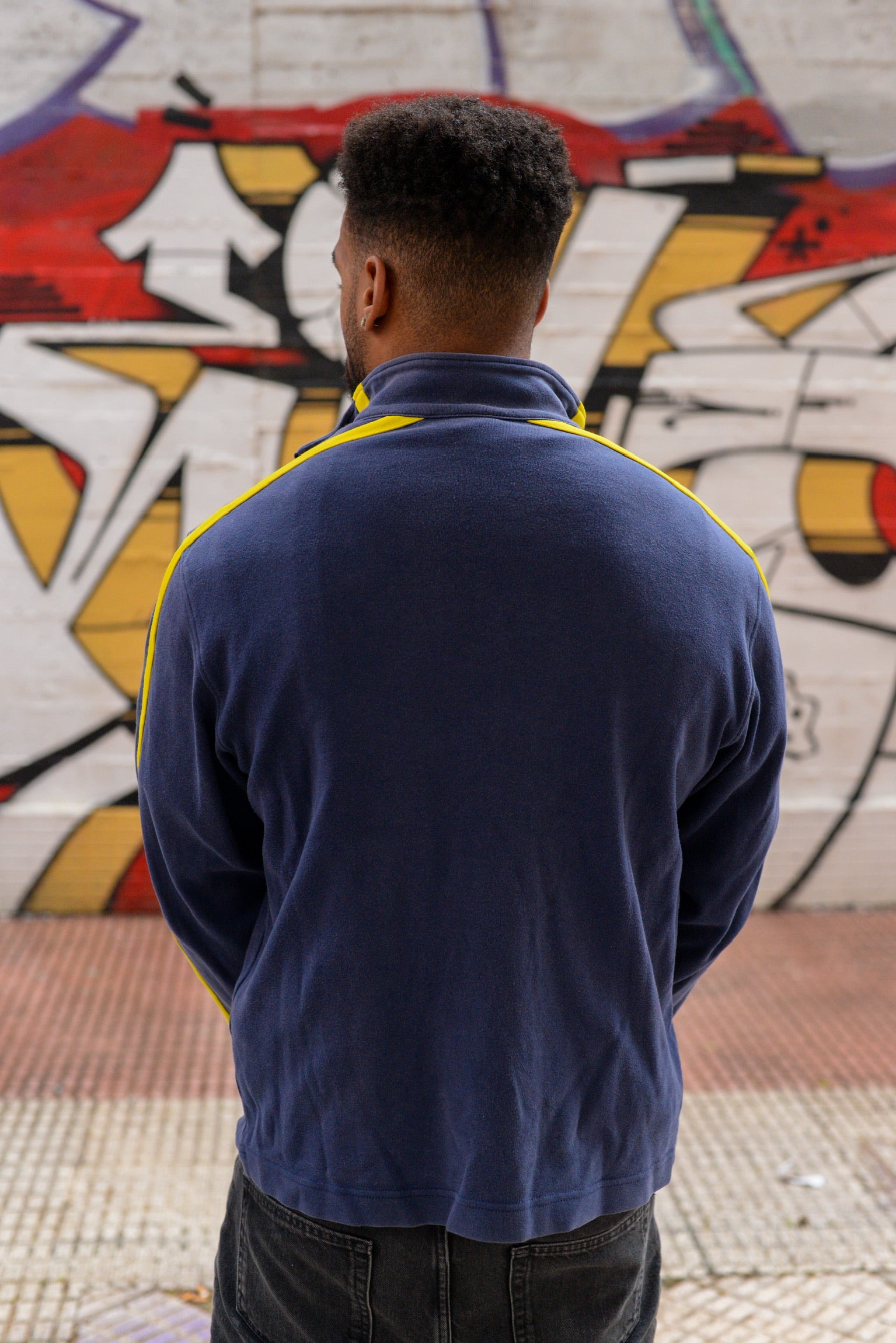 Chaqueta deportiva original Nike, estilo retro, en color azul marino con franjas amarillas en mangas y hombros. Diseño con cremallera completa y logo bordado de baloncesto en el pecho. Confeccionada en algodón suave, ideal para entretiempo. Una prenda única que combina comodidad y estilo clásico.