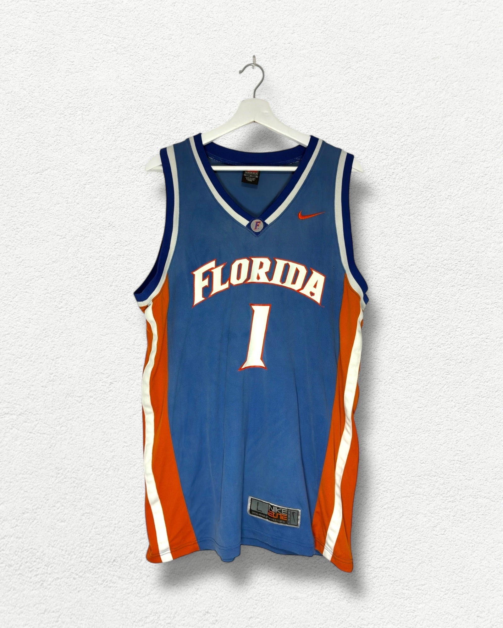 Camiseta vintage Nike Elite NCAA Florida Gators con número 1, en azul y naranja. Una pieza icónica para coleccionistas y amantes del baloncesto universitario.