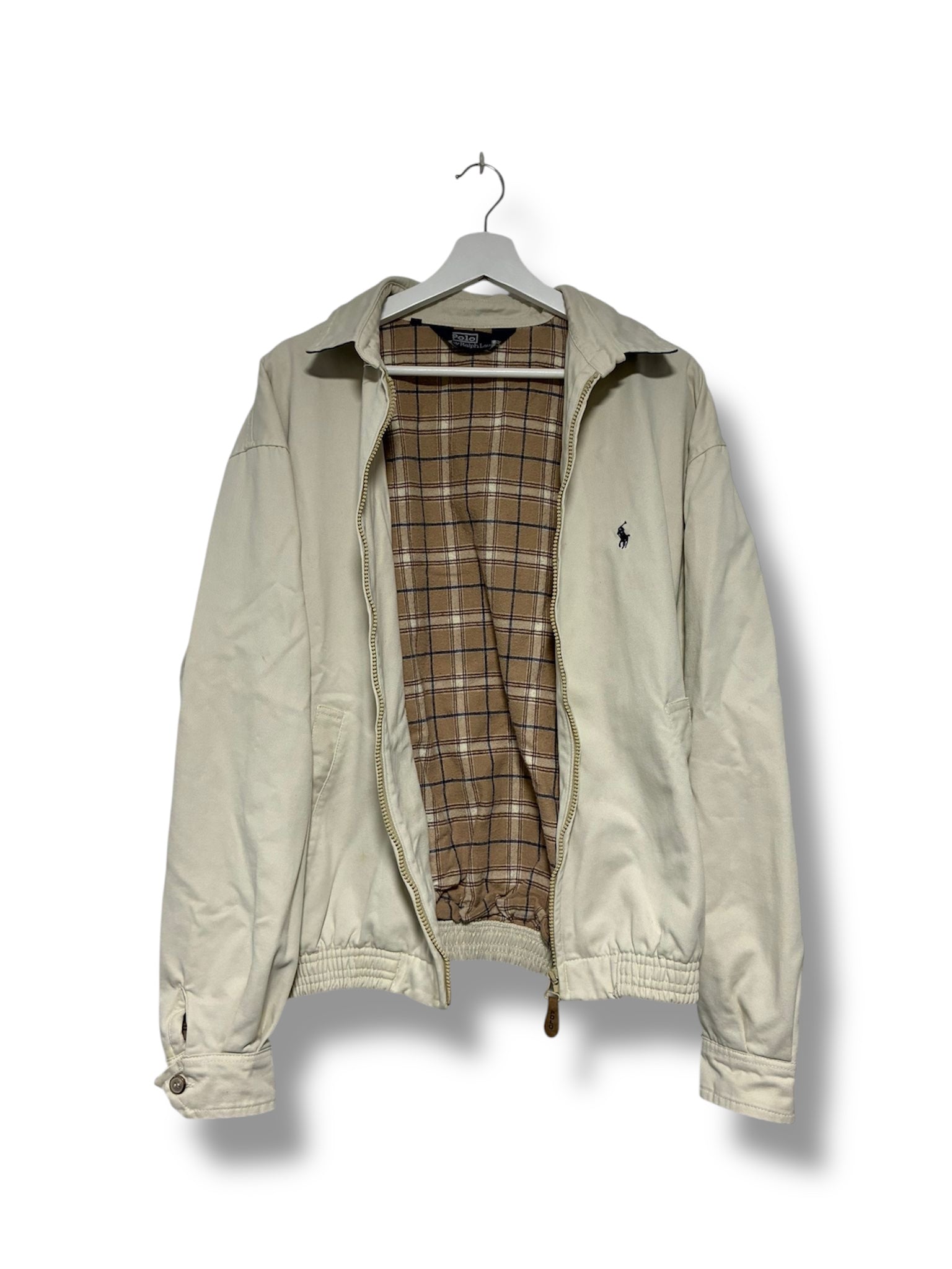 Chaqueta Polo Ralph Lauren estilo Harrington en color beige con interior de cuadros tartán clásico. Un diseño atemporal con el icónico logo bordado en el pecho que representa la elegancia casual de la marca. Perfecta para looks vintage y outfits smart casual.